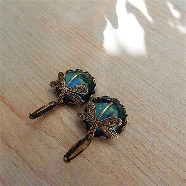 Vintage naušnice s tamnozelenim kristalom i ukrasom vretenca.
